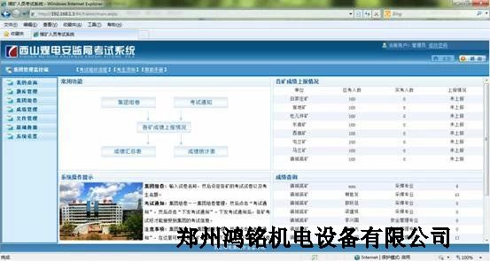(登陸界面) 二、技術創新點 1、分布式系統設計,使得系統具有良好的性能吞吐量,滿足西山九礦同時計算機考試。 2、批量試題導入導出:實現從word批量導入/導出試題,極大地提高了工作效率。 3、數據統一管理:實現集團統一組卷、統一成績管理。 4、實現考試情況統計分析,生成符合集團安全培訓考核要求的統計報表與統計分析表 5、快速、靈活組卷。實現快速、靈活組卷,同一考場允許不同單位、不同工種的人員同時參加考試。 三、太原企信科技有限公司 太原企信科技有限公司是一家專業從事軟件研發的高科技公司,公司位于太原高新區,是煤礦培訓與安全管理行業解決方案提供商。公司多年來形成了完善的煤礦安全